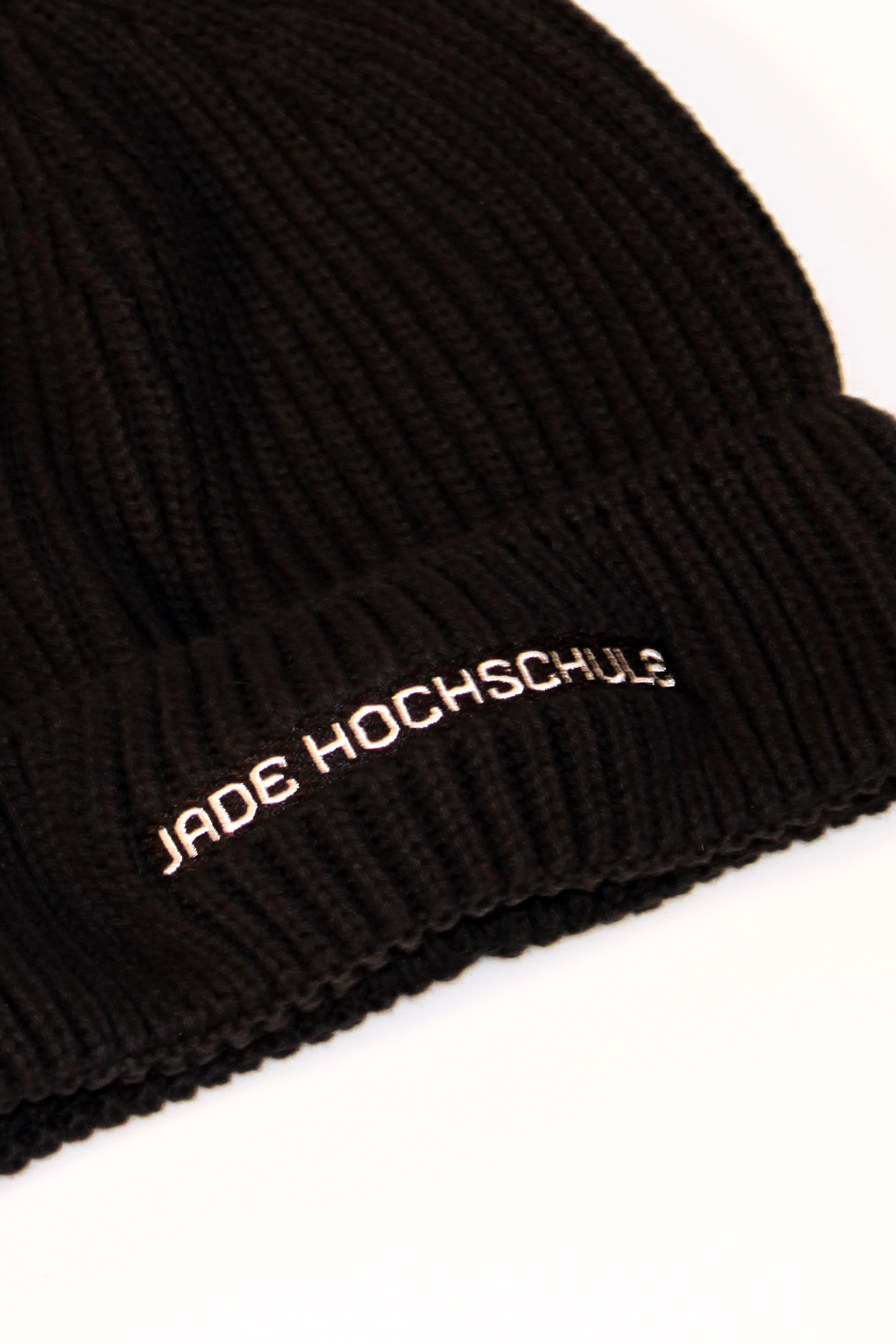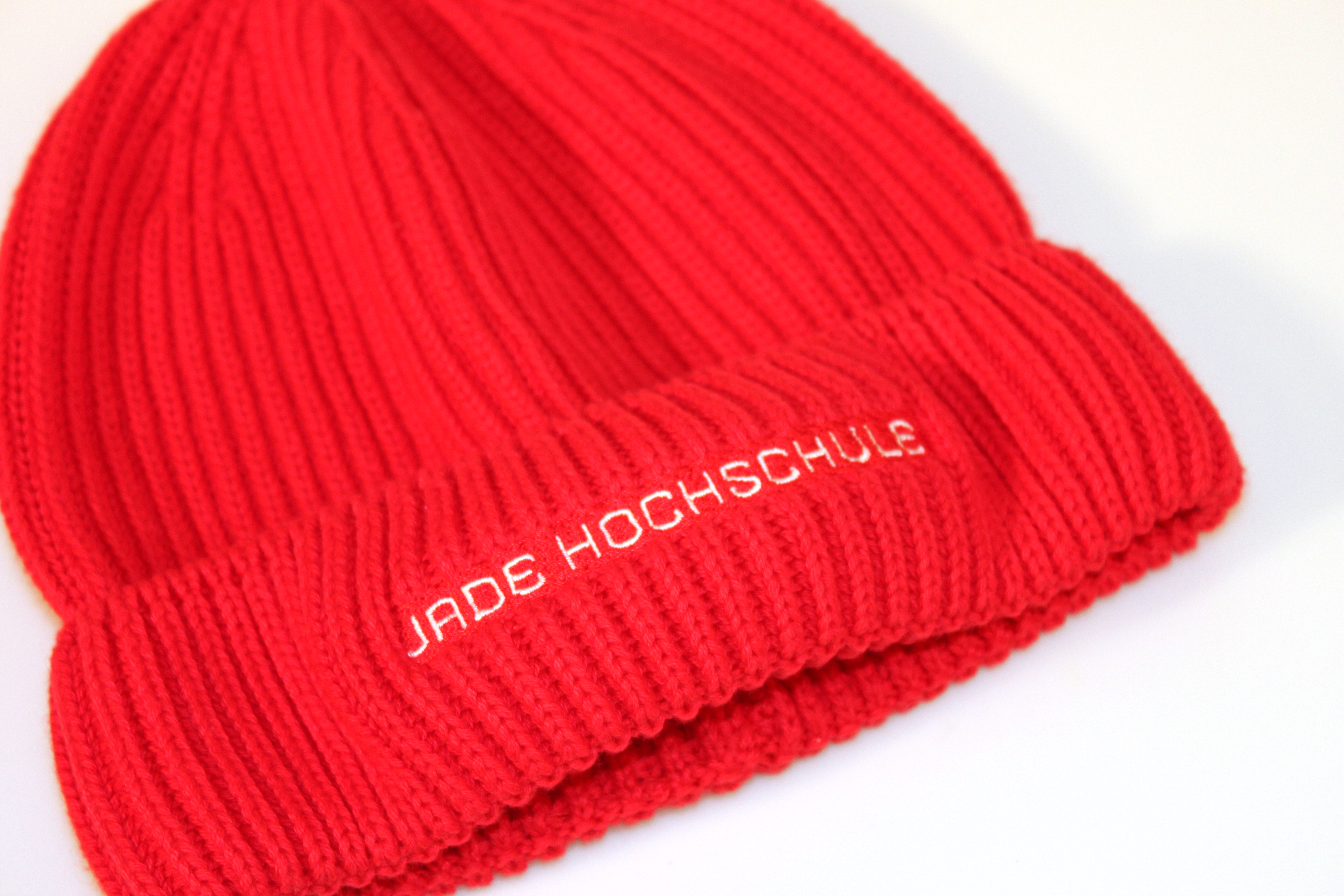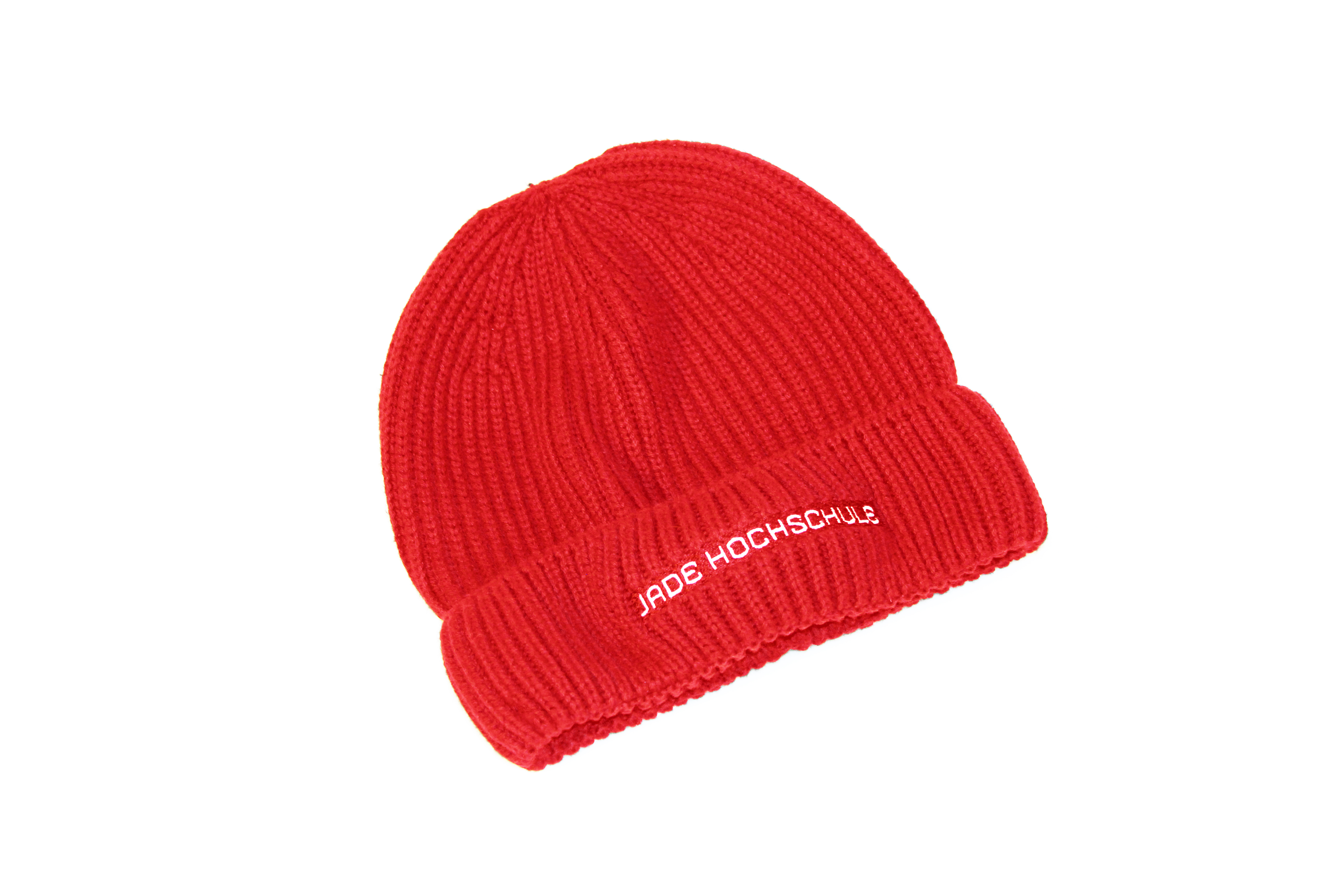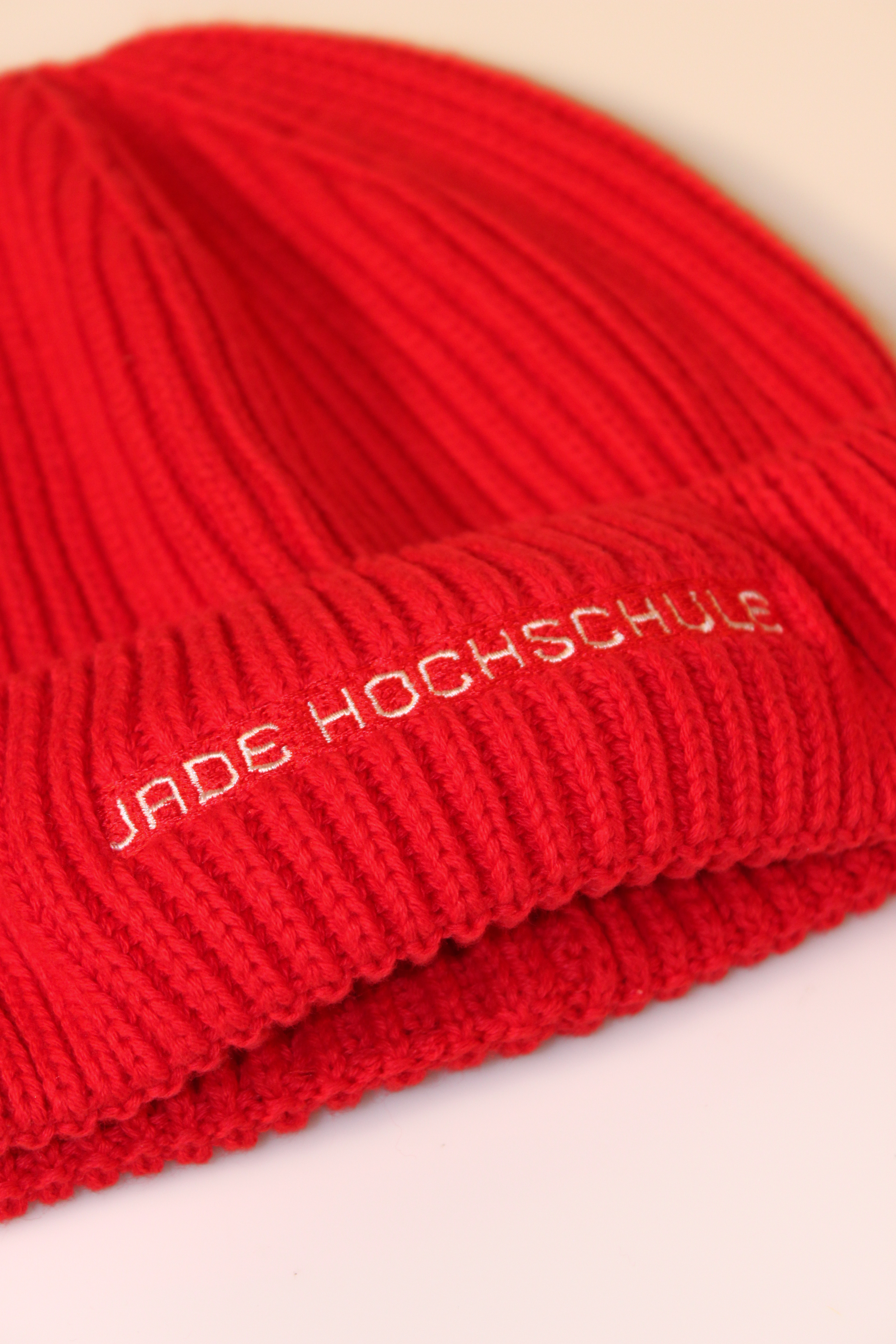 Grob gestrickte Wintermütze mit Umschlag 100% Bio Baumwolle, Klassische Schnittführung, angenehm weicher Griff, Ripp Design inkl. Stick Jade Hochschule in weiß, Einheitsgröße. Farben: schwarz oder rot